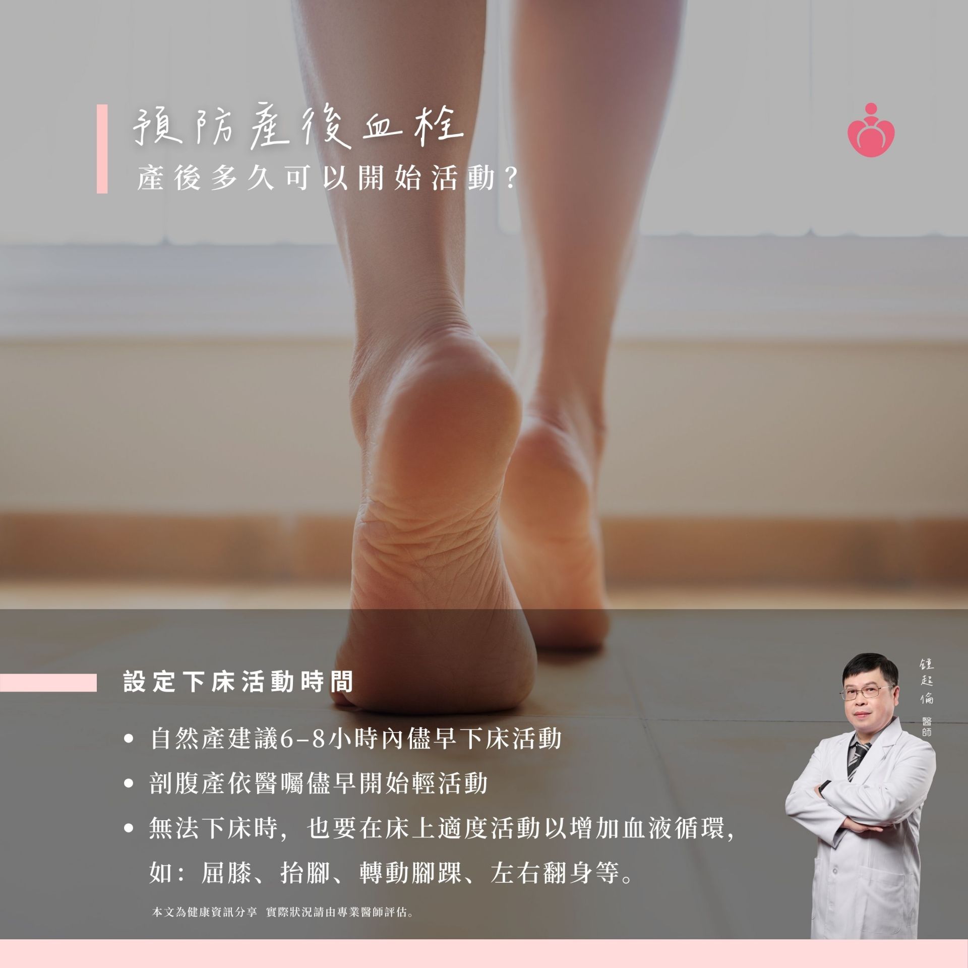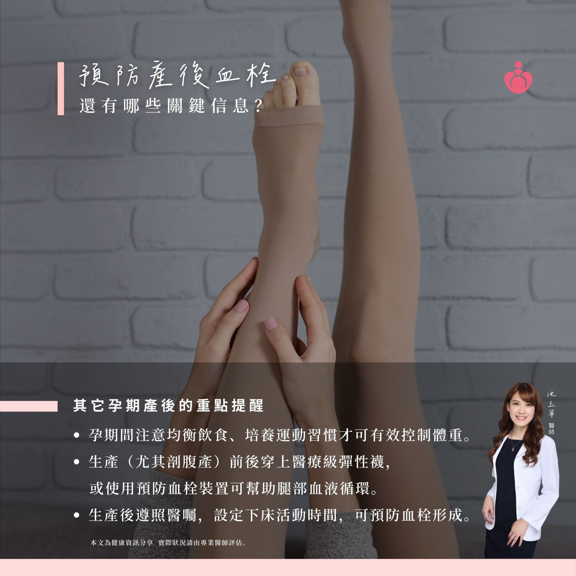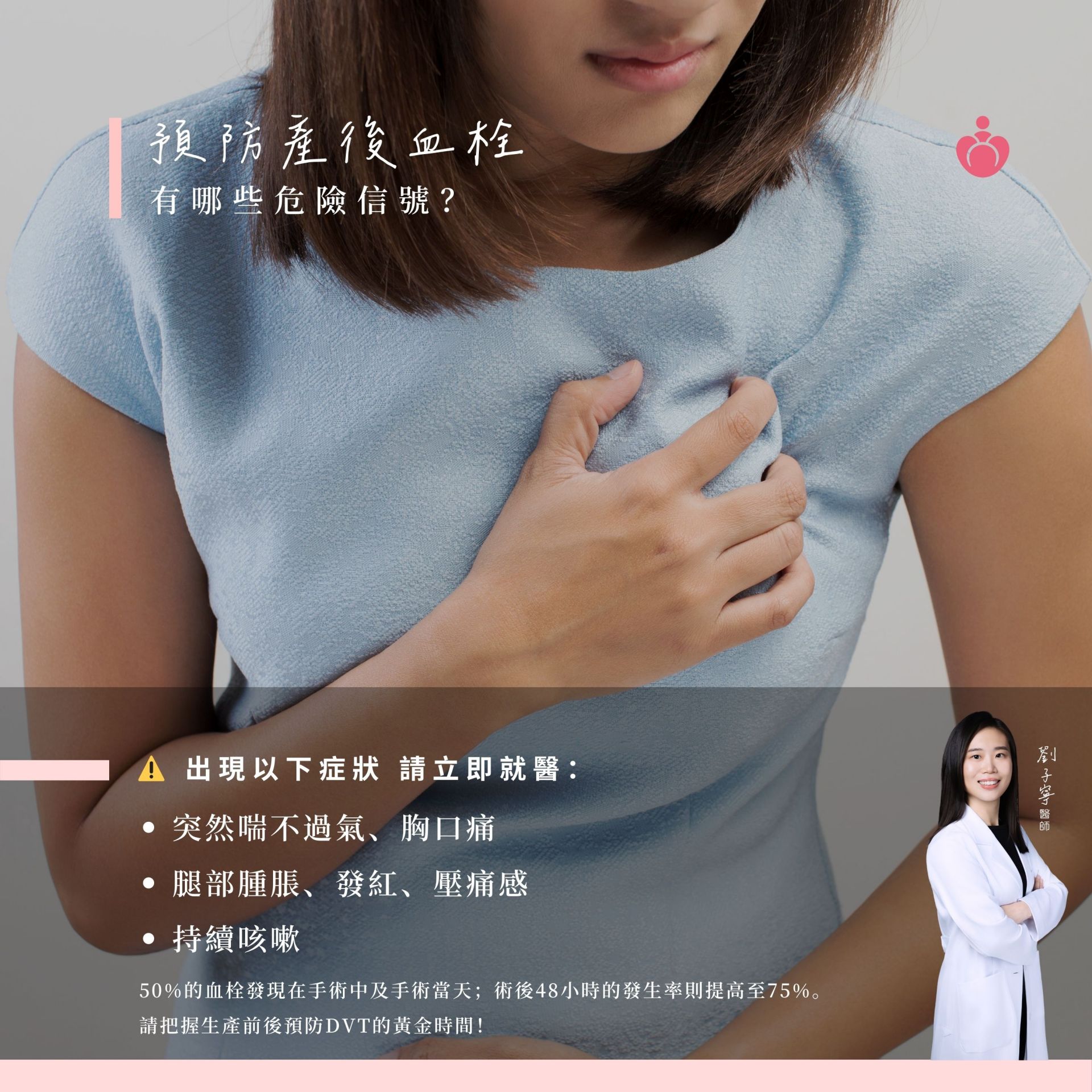 懷孕與產後 因長期臥床+活動量減少 導致下肢血液循環變慢 就容易發生深層靜脈血栓(DVT)。 如果血栓跑到肺部 更可能引發肺栓塞,危及生命! 剖腹產媽咪更是高風險族群 常見警訊 ✓突然喘不過氣、胸口痛 ✓腿部腫脹、發紅、壓痛感 ✓持續咳嗽 提醒您: 孕期間依醫囑執行體重管理 產前與醫師討論並設定產後下床活動時間 在宋俊宏婦幼醫院 我們能根據妳的孕期與術後狀況 提供專業的血栓風險評估 預防建議與合適的輔具 幫助妳降低風險 安心度過孕產期! 從生命開始,守護您的每一步 #產後血栓塞 #DVT #宋俊宏婦幼醫院