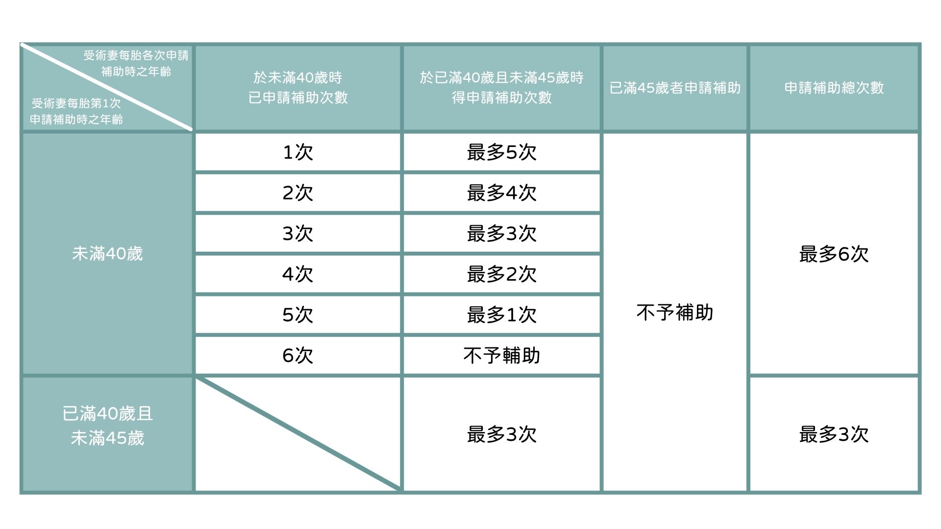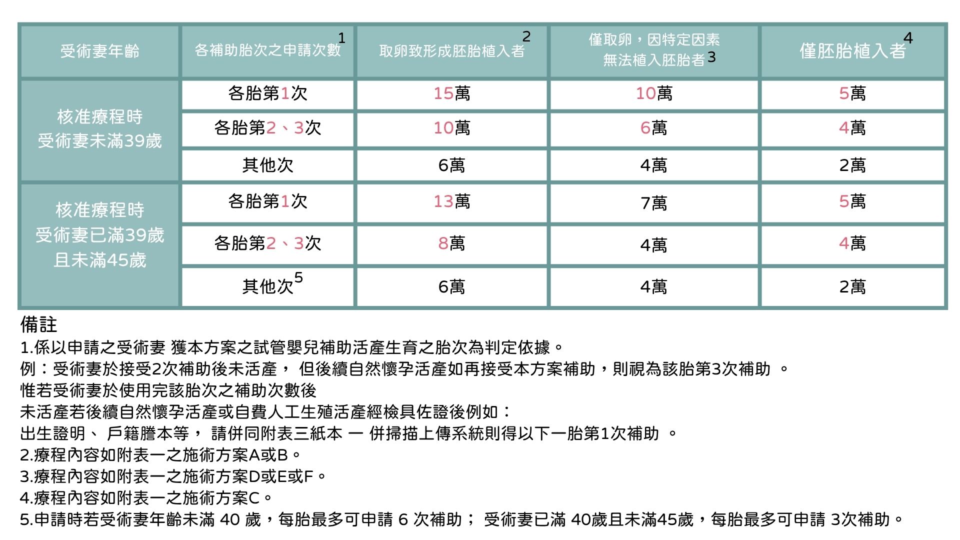 ■ 一次不成 再次相挺:鼓勵再次嘗試,受補助者未滿39歲,各胎之第2、3次療程最高10萬元;39至未滿45歲,同一胎第2、3次療程最高8萬元。